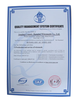 | About this company : Anping Jiangtai Wire Mesh Producing Co., Ltd, Established in 1982,is located in “The Hometown of Wire Mesh of China”. It is one of the leading manufacturers and exporters of all kinds of wire & wire mesh. We have advanced technology and equipment, scientific management ,strict quality control system.We also got the certificate of ISO 9001:2000 Quality Management System. Our main products are stainless steel wire mesh, dutch wire mesh, window screening, welded wire mesh, crimped wire mesh, hexagonal wire mesh, black wire cloth, expanded wire mesh, brass wire mesh, link fence, filter disc, nylon netting, perforated mesh, wire mesh fences, conveyer belt mesh etc. Since 1982,we have been trying our best to improve and update our products and have won an excellent reputation for high quality. Our products have been exported to USA, Canada, Germany ,Singapore, Korea, Australia, Pakistan, India, and many other countries. We sincerely hope to establish a good & long-term business relations with customers all over the world. We can provide "high quality wire mesh & best price & perfect service & fast delivery". If you are interested in our products, pls contact us as soon as possible. | ||||||