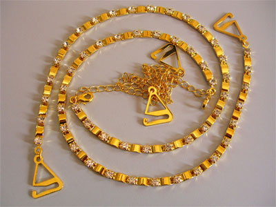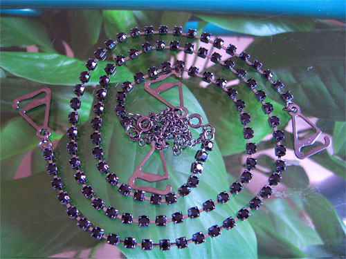 ![]() | Rhinestone bra straps Description : 1) Material: 100% brass 2) Main chain 32cm excluding hook, accessory chain 18cm excluding hook 3) One row strap with 94pcs diamante 4) Gold, Black and silver coating available 5) Blue, prink, clean, black and green diamante available Minimum order: 200pairs/style/color Each pair of bra straps are very well presented in a beautiful Strap pouch which makes them perfect as a gift item | |||||
