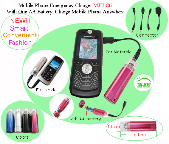 ![]() | Mobile Phone Emergency Charger, MJH-C6 MJH-C6 Mobile Phone Emergency Charger, Only with one AA battery, Unlimited power supply for your cell phone..Anywhere!!! New !!! 1. Introduction This award-winning, innovative product makes your cell phone charging simple and sustainable. Instead of buying wind up chargers, and disposable chargers. Only use one AA battery, hook the cable to your cell phone, and charge will convert the energy in the battery into power for your cell phone without any electrical outlet. Since you can find the AA batteries all over the world, it's easy to throw this in a bag or in your glove compartment and charge up your cell phone or extend your talk time during an important call. 2. How it work A. Load a single AA battery (included) into the Charge and a small, red light will begin flashing. B. Connect your phone-specific connector to the flashing unit. C. Connect your phone to the connector - all 4 connectors are included with each unit. D. Your phone indicates that it is charging. 3. Features: 1) Truly wireless battery charger for mobile electronics 2) Ideal to use as a travel charger, thus eliminating the need to carry to bulky device chargers 3) Uses one replaceable AA battery 4) A safe stream of power to charge cell phones and shuffles 5) Up to 3.5 extra hours of talk time 6) Up to 90 hours of standby time 7) Aluminum body 8) Chooses phone connector (please kindly tell us which type of phone do you need to fit with our charger) 9) Charging current: 300mA maximum (varies with usage conditions) 10) Adds up to 240mAh to devices battery per AA battery 11) Typical efficiency: 80%-93% 12) Automatically starting up when current is drawn at the output (upon connection to device) 13) Open-circuit output voltage: 5.0V 14) One indicator LED light (when is in charging, the LED is in blue color) | |||||
