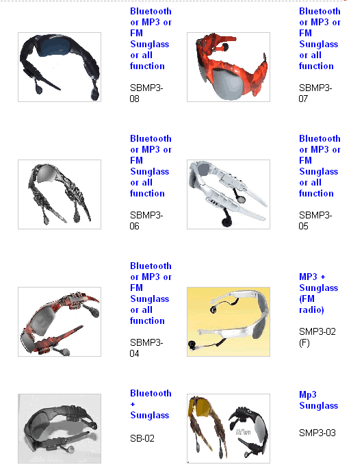 ![]() | Bluetooth MP3 Sunglass FM Radio * 2 in 1: Bluetooth and MP3 Sunglass Bluetooth Version: 1.2V. Range: Class 2, 10 meters Combination of Bluetooth and MP3: When calls come in the mp3 player will suspend and shift to bluetooth operation. When it come back to bluetooth operation, can record the communication content when calling PC interface supported: USB Digital formats supported: MP1 / MP2 / MP3 / WAV / WMA / ASF / WMV etc. Signal-to-noise ratio: 87.2dB Playback Modes: Random play External hard drive function: Yes Sound output mode: Stereo Audio Additional features: Auto-power off Earphones type: Binaural Mfr estimated battery life : 6 hours continuous Charging Time: 3 hours continaully Talking Time: 5~6 hours, Waiting Time: 150 hours Playing Music: 6 hours Battery tape/capacity: Built-in Lithium lon Polymenr/3.7v, 150mAh Maximum input power rating: 5VDC, 150mA Voice output power: 55mW Voice output frequency: 20Hz-20Khz Earphone impendance: 16 Ω*2 Memory Flash: 128MB-1G The resilient glass, which is comprised of 11-layer materials, is introduced from polarized lenses produced by an American company Polaroid. The 1st layer: Polarizing Layer, the core of polarized lenses, provides over 99% polarized light and also it can effectively absorb the reflected glare vertical to light-through axis to make lens most suitable for fishing / driving / sailing / hunting/skiing / sports, etc. The 2nd and 3rd layers: Adhesive Layer makes the polarized lenses effectively resist incision/ bending/ cutting piece to expose it in severe environment. The 4th and 5th layers: UV Absorbing Layer makes polarized lenses effectively absorb over 99% UVA ( 315-380mm ) and over 99% UVB ( 280-315mm ) The 6th and 7th layers: Impact Resistance Layer has quality tenacity and impact resistance. The 8th and 9th layers: Polarizing Color Layer provides excellent protection to reduce the visible light transmittance. The 10th and 11th layers: Over-polished and Hard Coating Layer effectively prevents lens from scratch on the surface. The ordinary polarized sunglasses usua1ly have 0.75mm lens, while this type of polarized sunglasses have 1.13mm thick and hard coating lens, compared to lens typed with 0.75mm, they have many advantages such as distortion resistance, higher solidity and a higher degree of wear resistance. The flip-up lens is a material that blocks 100% of all UVA, UVB, UVC and harmful blue light. Package: Size: 170x160x40mm, N.W. 54g, G.W. 300g, 30pcs/Box, Box Size: 900x240x300mm Accessories: 1xCar charger./.1xAC Adpater/ 1x User Manual/ 1xDisc/ 1xUSB Cable / Car charger. Every pcs in a Leather Box, we give you three kinds of charger (USB charger, Car charger, Desktop Charger), then in color gift box. | |||||