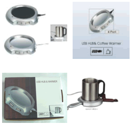 ![]() | USB Warmer USB Tea / Coffee / Cup Warmer & 4 Port Hub Ever get too involved with your work on your computer only to find that the delicious hot coffee / tea you made is now ice cold? Keep your drinks warm with this USB powered Cup Warmer which also includes a 4 port USB Hub. Simply plug this device into a spare USB port onto your computer and turn on using the power button. Within seconds you will be able to feel the heat from the warmer and within 2 minutes it will be at the ideal temperature to keep your drinks warm. With a 4 port hub built in you will now have an extra 4 USB ports on your computer - have a look at our other USB items and get yourself some more gadgets. This model comes with a power switch unlike the older models available which had to be unplugged to turn off. The heating pad does get extremely hot so please be careful where children are around. -4 USB ports -Supports both full speed 12MB/sec and low-speed 1.5MB/sec transfer rates -Chains up to 127 USB devices -Individual port over current protection -USB1.1/2.0 available -Keeps coffee / tea / drink / warm at 50oC-60oC -Rated power: 2.5W-5V DC -With on/off switch -Clear cable: 1.5m -Worldwide patent pending Features · Keep coffee/tea/drink warm at 50-60șC · Easy installation no driver required, plug & play · Rated power:2.5W-5V DC. · With on/off switch · Red LED indication when warmer is turned on. · Quality insulation material around the metal hot plate prevents burns. · USB powered, no batteries needed. Specification · Plug the USB cable into the computer USB port, and the green power indicator will light. · Place the cup on the plate · Turn on the warmer switch · The red warmer indicator will light, and you can keep coffee/tea /drink warm. · Turn off the warmer switch when not in use. Notice · Temperature will be reduced if sharing with other USB devices. · touch the plate(1) directly when is in use. · Unplug the USB cable before cleaning the warmer. Package Box · 37.5*31.5*55.5cm, 100pcs/CTN G.W./CTN: 14.8kgs Volume/CTN: 0.066CBM | |||||
