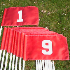 ![]() | Golf Flag Golf Flag Include Red and White Set, Yellow with Black Numbers Set. Size: 14"x20", has appliqued (sewn) or dyed numbers and has 3 brass grommets. Available as a complete 18 flag set or outgoing or incoming numbers (9 flag set). | |||||