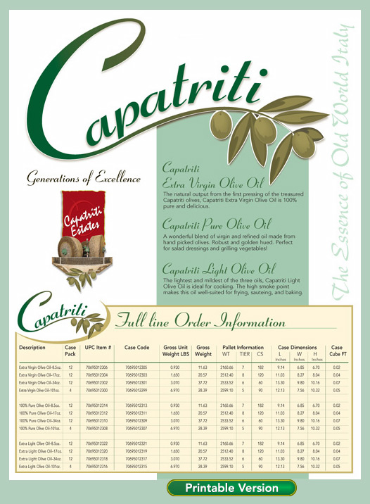 ![]() | Extra Virgin OLIVE OIL , Capatriti Pets,Glass,tins The Gourmet Factory is a leading company of olive oil, olives, cheeses, tomaotes, capers, peppers, spices and other European delicacies. The company markets and distributes such outstanding brands as: Capatriti, Mes, Olio Villa, Lakonia, Zorba, Traditional and Mama's Choice. | |||||