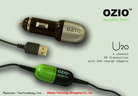 ![]() | FM Transmitter U20 Four FM channels (87.7MHz, 87.9MHz, 88.1MHz, 88.3MHz) - Built-in antenna - Digital phase locked loop circuit, minimize interference - High quality stereo audio, separation up to 50dB - High fidelity, average signal distortion low than 0.1% - Lower background noise, Signal/Noise Ratio up to 65dB - Maximum transmit distance: 30ft - USB interface charge and power adaptor | |||||