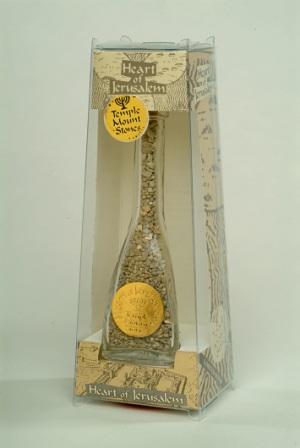 ![]() | Holy Land unique souvenir We place a great emphasis on the originality of the stone and the land. Therefore, we have issued original certificates to verify the authenticity of the products. In addition, the certificates from the removing contractors and the Israel Antiquities Authority have been blessed by quite a few rabbis and leading public figures.All company products have undergone testing to prove their authenticity. All company products are packed and sealed under the supervision of an attorney and with special markers and serial numbers appearing on each and every product. A great deal of time was invested in the selection and design of the products, as well as their adjustment to the clientele and the formulation of the texts appearing on the packages. The product is “Temple Mount Soil” sold as a souvenir (from the Holy Land in general, and specifically the Temple Mount), under the brand name Heart of Jerusalem. Image of the product 40 ml triangular glass bottle, stamped, sealed and adorned with a gold plated coin A unique label of pure gold is stamped on the bottle in a quality and special, semi transparent, durable package, at a prominent location and of design orientation relating to the product origins. | |||||