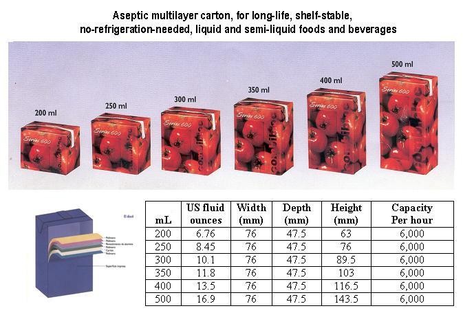 ![]() | Tomato sauce, fruit juice, tea n/a tomato sauce, fruit juice, tea. Aseptic technology process (long-life). Multi-layer carton. Sizes: 200, 250, 300, 350, 400, and 500 mL. With or without straw attached. 24 per tray. Tray plastic wrapped. | |||||