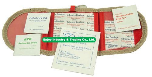![]() | First Aid Kit FAK20 Description:First Aid Kit Bag material:70D nylon size:11x10x2cm parts: Gauze Pad5"x5" 1pcs Adhesive Bandage1.9x7cm 5pcs Alcohol Prep Pad 5cmx5.5cm 2pcs Antiseptic Swab 5cmx5.5cm 2pcs Adhesive Bandage1x4cm 5pcs Adhesive Bandage round 2pcs Indone Pad 1pc | |||||