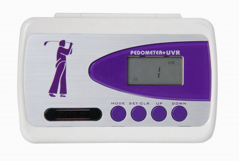 | M229C Name-card holder Pedometer with UV tester M229C *LCD clock with 12/24 hour *Step counter: counts from 1 to 99,999 *Individual weight set-in function: calories burnt in Kcal will be more accurate by setting in your body weight. *Individual stride set-in function: distance travelled will be more accurate by setting in your stride. *Alarm clock. *Countdown timer:can count up to 23H 59 minutes. *UV tester:can test 0~8 level *Can put 10 pcs business cards in it. | ||||||