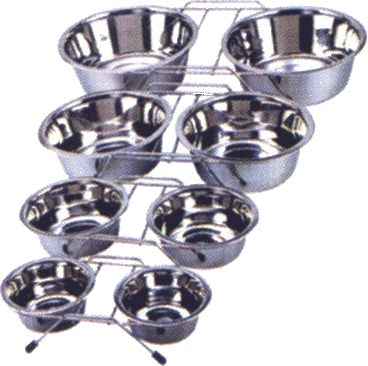 ![]() | Double Diners for Pet FBS-2D Stainless steel bowl sets. No need to dump both food and water to clean or empty one. No slopping food into the water or into the food. FBS-2D045 : inner diam. 12 cm, outer diam. 13.4 cm, bottom diam. 8 cm, height 4.8 cm, capacity 700 cc FBS-2D090 : inner diam. 14.5 cm, outer diam. 16.3 cm, buttom diam. 11.5 cm, height 6 cm, capacity 700 cc FBS-2D180 : inner diam. 19.2 cm, outer diam. 21.4 cm, buttom diam. 15.5 cm, height 6.5 cm, capacity 900 cc FBS-2D280 : inner diam. 22.5 cm, outer diam. 24.7 cm, buttom diam. 17 cm, height 7.5 cm, capacity 1800 cc | |||||