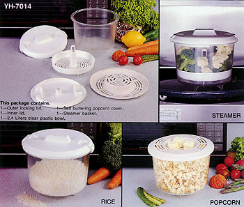 ![]() | Specialty Microwave Set YH-7014 includes pasta & rice cooker / self buttering popcorn / food steamer. Capacity : 2.4 litres.( 18.5 x 16cm ) steamer basket ( 15 x 9cm ) | |||||