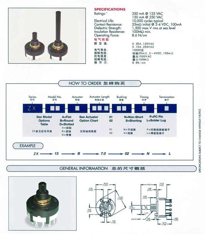 ![]() | Rotary Switches Specifications: Ratings: 350 mA 125 VAC 150 mA 250 VAC electrical Life: 10,000 cycles typical Contact Resistance: 25 mo initial 2-4 VDC, 100 mA Dielectric Strength: 1,5000 max V rms at sea level Insulation Resistance: 100 mo min. Operating Force: 8.6 N/cm Ra | |||||