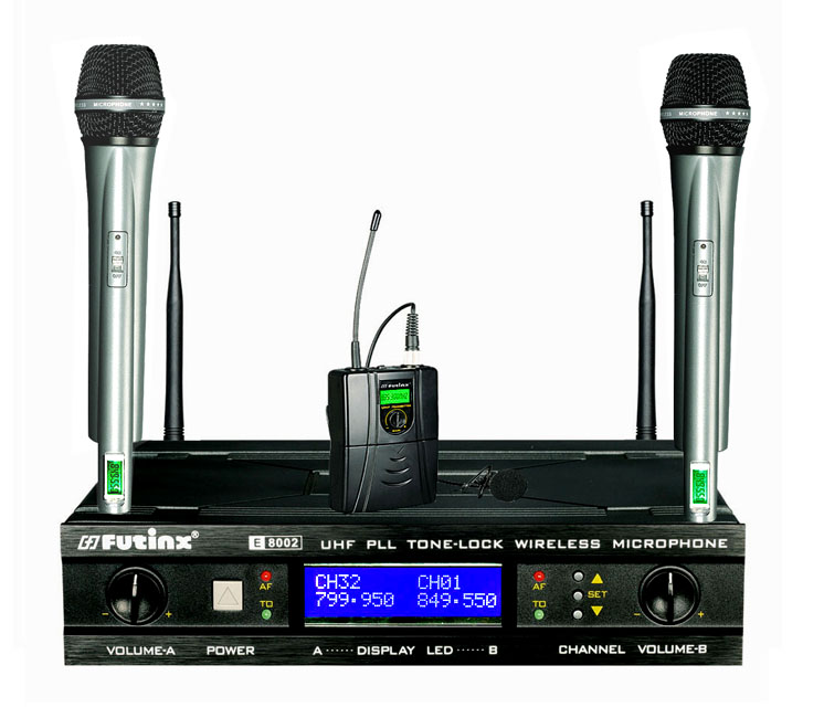 ![]() | wireless microphone E-8004 Technical specifications ansmitter 1.Operating frequency: 720-880MHz 2.Adopt CPU control 3.With PLL combined technology 4.With 32 channels for free selection and LED display 5equency stability: +/-0.002% 6.With FM max frequency adjusting: +/-45KHz 7.Pre-warning display for weak battery 8.Audio frequency response compression and auto electricity level circuit Receiver 1.Operating frequency: 720-880MHz 2.Adopt CPU control 3.With PLL combined technology 4.With 32 channels for free selection and LED display 5equency stability: +/-0.002% 6.Noise locked +Pilot tone locked 7.Audio frequency response expand and auto electricity level control circuit | |||||