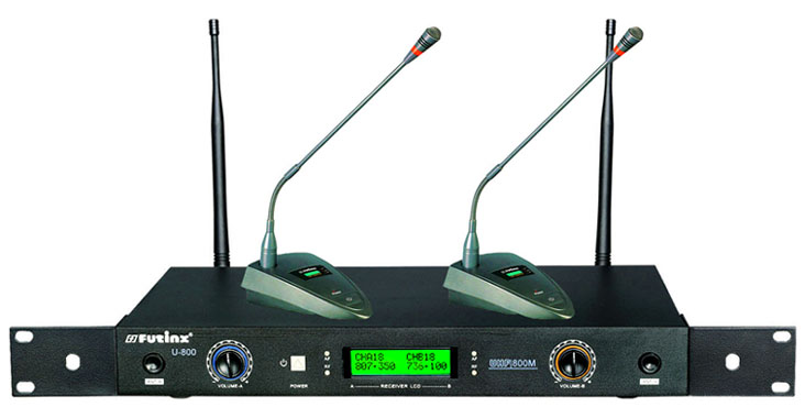 ![]() | Wireless microphone U-800 Technical specifications Transmitter 1. Operating frequency: VHF:180-280MHz UHF:500-880MHz 2.Adopt CPU control 3.With PLL combined technology 4.With 32 channels for free selection and LED display 5equency stability: +/-0.002% 6.With FM max frequency adjusting: +/-45KHz 7.Pre-warning display for weak battery 8.Audio frequency response compression and auto electricity level circuit Receiver 1. Operating frequency: VHF:180-280MHz UHF:500-880MHz 2.Adopt CPU control 3.With PLL combined technology 4.With 32 channels for free selection and LED display 5equency stability: +/-0.002% 6.Noise locked +Pilot tone locked 7.Audio frequency response expand and auto electricity level control circuit 8ue diversity receiver | |||||