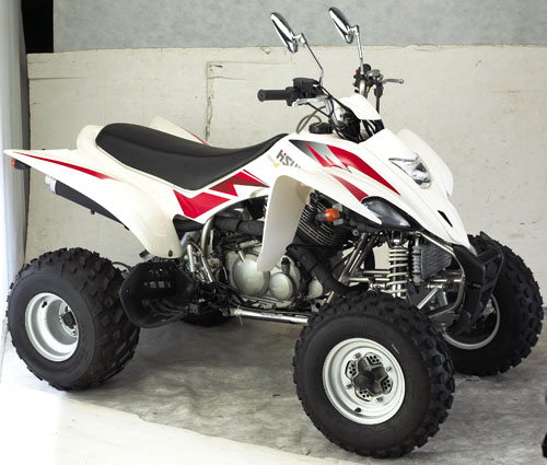 ![]() | ATV HS350ATV-2 Specifications ENGINE Type:348cc,oil cooled,4-stroke,1-cylinder Bore x Stroke:83mm x 64.5mm Compression Ratio:9.2:1 Carburetion: PD36G Ignition: CDI Starting: Electric Transmission:1-N-2-3-4-5-6-R Drive Train:Chain CHASSIS Suspension:Independent double swing arm Suspension/Rear:Independent double swing arm Brakes/Front:Dual ventilated hydraulic disc Brakes/Rear:Ventilated Hydraulic disc Tires/Front:AT21 x 7-10radial Tires/Rear:AT20 x 10-9 radial DIMENSIONS L x W x H:1760mm x 1110mm x 1180mm Seat Height: 830mm Wheelbase: 1230mm Ground Clearance:250mm Fuel Capatity: 9.0L Dry Weight:194kg Loading Quantity:12pcs/20'GP;26pcs/40'GP;38pcs/40HQ OTHER Lighting:12V35W/35W x 2,12V5W x 2(front); turning light 12V10Wx4(F&R);12V.5W/21W x 1(rear) Warranty:6 months(limited factory warranty) | |||||