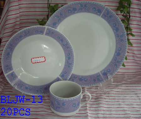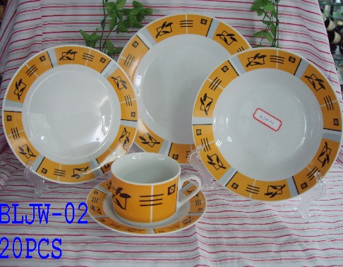 ![]() | porcelain dinnerware set 2 pcs BLJW-02 20 pcs Dinner set 1) Composition: 4pcs 10.5" dinner plate 4pcs 8" soup plate 4pcs 7" dessert plate 8pcs 220cc Cup & Saucer 2) Material: porcelain ware 3) Quality: AB grade 4) Packing details: Pack in Color box 1set/box, 2sets/ctn 1600ctns/40'HQ | |||||
