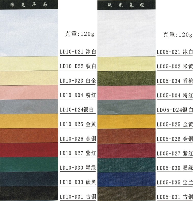 ![]() | Pearl Luster Paper(Metal Finished) LD10-D21~31; LD05-D21~31 Pearl paper: v Features: 1) Gorgeous color 2) Excellent moisture-resistant, abrasion resistant and folding endurance properties Specifications: 1) Sizes available: 787 x 1092mm, 889 x 1194mm, and any other sizes as per sample 2) Weight: 120, 250gsm, or others as per sample 3) We can provide competitive price, best quality, and excellent service Packing: 125 sheets /pack 250 sheets /pack Applications : gift, bookbinding, invitation cards, greeting cards, high-grade calendars, bankbooks, certification paper, packaging for wine and cosmetics, as well as other high-grade gift packaging purposes | |||||