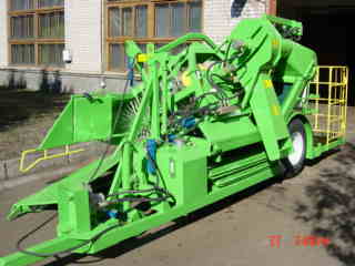 ![]() | Combine of picking berries USK-1 Jovaras Combine "JOVARAS" is intended for the harvesting of the bushy berries: black, red and yellow currants, gooseberriesbine is aggregated with the tractors of different tractive class, whose power is not less than 20 kN. On the basis of the work of combine "JOVARAS" lays the principle of the sluggishness of mass. With the harvesting of berries bush undergoes vibration with such speed, with which the value of the resistance, exerted by the pedicles of berry brush, occurs less than the amount of that force, with which its own mass of berry is attempted to be held on the pedicle in the beginning of vibration motion. The knot of the lift of branches, sliding above the earth, raises the lying branches and will give them for lower guides under the fingers of working shaft. In also the time suitably the disposed lateral wing- separator separates more than half of a number of bushes, bends the branches of bushes, and will be given they under the fingers of working shaft. The fingers of working shaft it rapidly shakes branches, berries break themselves and fall on the transverse conveyer, which transfers berries it upward and pours out them to the longitudinal conveyer. Longitudinal conveyer directs berries into the purifying zone under the fan, where suck out the particles of soil, twigs, small stones and other impurities. After the process of the entry of berries into boxes they follow tractor operator even one worker. Worker, being located on the platform of combine, substitutes the filled boxes; it follows the work of conveyers and other mechanisms of combine. Technical data Model USK-1 Output, ha/h 0,1-0,25 Picking berries,% 97 Impurity, % <1 Working speed, km/h 0,5-2 Driving system hydraulic Overall dimensions(length/width/height), mm 5900/2700/2300 Weight, kg 1650 | |||||