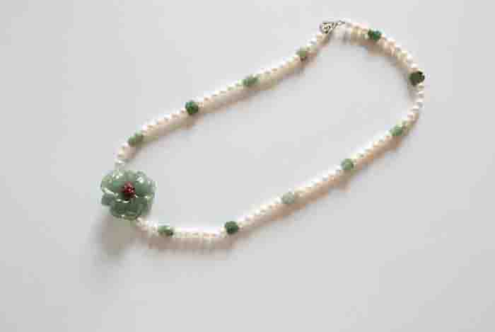 ![]() | fashion jade jewellery A823 Bead pearl charm necklace, sterling silver, this necklace made up of a strand freshwater pearls, and was interspersed some green bead jade. This jade with a flower pendent, flower means blossom and wealth in China. | |||||