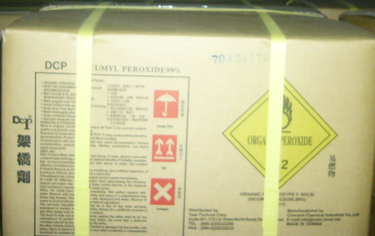 ![]() | DCP Dicumyl Peroxide DCP 99% DCP Dicumyl Peroxide CAS NO: 80-43-3 Empirical Formula: C6H5C(CH3)00(CH3)2C C6H5 Appearance White Crystalline Powder Applications: 1. Cross linking agent for EVA foam. When cross-linked by DCP, the foamed EVA possesses special properties better than that of other foamed materials in lightweight, coloration and abrasion-resistance. It has become as an essential ingredient for making sandals, slippers and shoe soles. 2. Cross linking agent for polyethylene insulated electric cable (XLPE cable) In the production of insulated electric cables, polyethylene after cross-linked by DCP, can resist high temperature caused by electric current in the wire. It has become a very important material in the field of wire and cable. 3. Vulcanizing agent for EPR & EPT. ERP & EPT are newly developed synthetic rubbers which have given indication of sufficient quality to merit careful consideration for wire and cable coating and conveyor belts. EPR cannot be cured by sulfur, however can be efficiently cured by DCP or other organic peroxides. DCP becomes a necessity in improving the heat resistance capability of EPT. Packing: 16MT/FCL(20KG/CARTON) 5kg/bag 4 bags are put in one carton or 10 bags are put in one fiber drum. | |||||