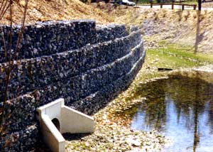 ![]() | Garbion basket Gabion baskets and mattresses form containers, that when filled with stone, provide an aesthetic method for retaining earth or controlling soil erosion. As a method for retaining earth, gabion baskets are stacked atop one another to form retaining walls, culvert headwalls, bridge abutments or bridge wing walls. Erosion control uses involve laying baskets or mattresses side-by-side on the ground to develop channel lining, bank protection, weirs and drop structures. | |||||