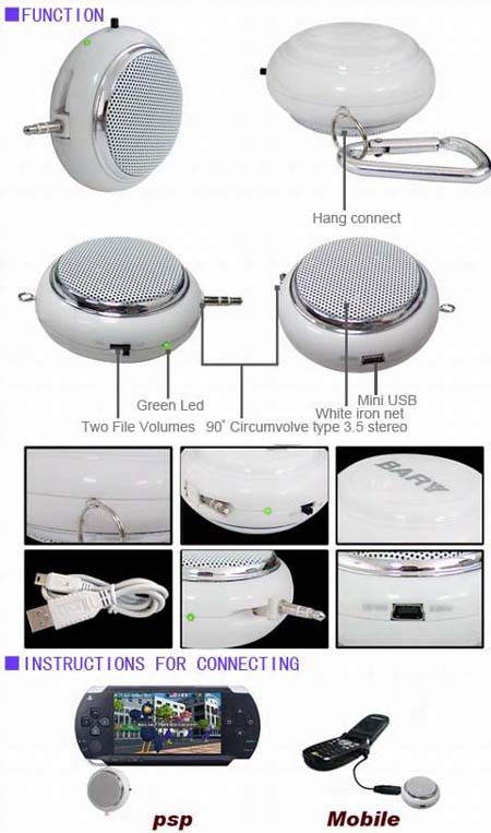 | digital mini speaker ST-1108 supply digital mini speaker as attached picture, with stereo can compatible to Mobile phones, IPod ,MP3,MP4,,PSP,PC,CD etc spec : fashionable vogue appearance cabinet, ,timbre solid color concinnity,collocate Hang The inside places the high-quality polymer lithium battery,USB charge. Amplifier,battery,Hi-Fi Speaker in the integral whole. 5.90 circumvolve audio Input stereo. power supply show and charge show(Both color LED). Two file volumes regulate. | ||||||