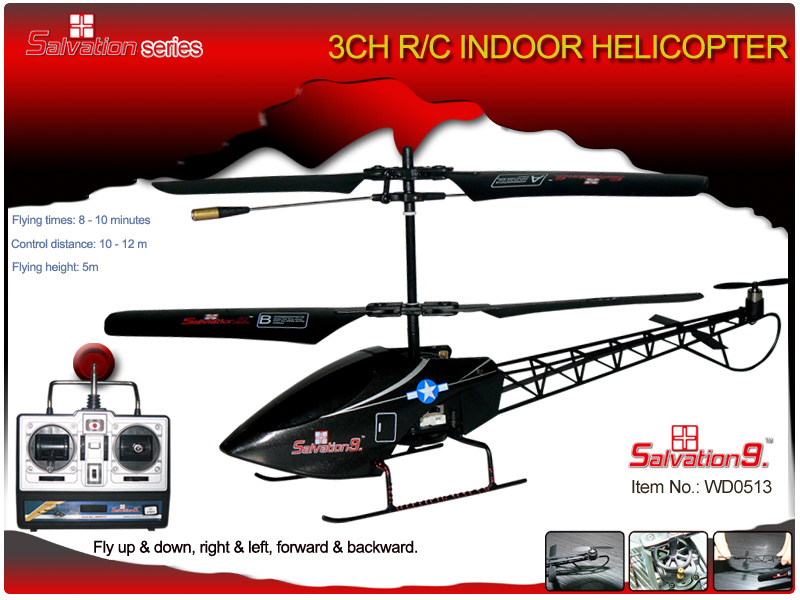 ![]() | RC helicopter known as Salvation9 WD051 Description: 3CH RC Mini Helicopter (Salvation 9) with Li-Po Battery, flying time 10-12 minutes. Proportional controlling system; going up & down; forward & backward; turning left & right; Perfect for indoor flight. Main features: 1. Up to 10-12 minutes flight time. 2. 3.7V 350mah li-po battery is installed in the helicopter. 3pletely stable in flight. /Perfect for indoor. 4. 3D flight, go forward, left and right 5. Rear rotor stabilizer for controlled turns 6. Hover trimming tab on controller stable hover and full 3-D flight 7. 3-ch radio controller. Package contents: A. 1 X helicopter; B. 1 X controller; C. 1 X 3.7V output transformer; D. 1 X manual. Euro13.79/pc | |||||