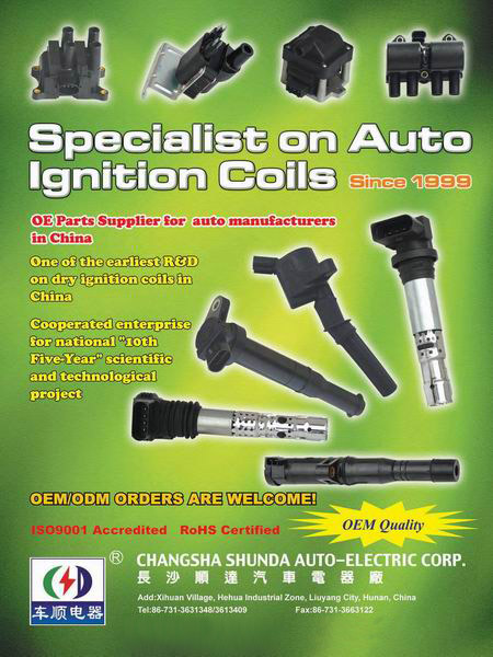 | About this company : Changsha Shunda Auto-electric Corp was founded in Changsha City-the home of China high quality automobile appliance, with 12KM far away from Changsha Huanghua International Airport! We are the first private enterprise that specializes in auto dry ignition coil since 1999. At present, 30 outstanding senior technicians gather together, engaging in R&D of auto ignition coils. We have assigned as Hunan Provincial Hi-Tech Enterprise in 2006. We have been passed ISO9001:2000 and RoHs certification. Most of our items are well-seller in European and American Market! Our equipments are NC winding machines, vacuum epoxy casting equipments, automatic pipelining, accurate testing instruments, temperature cyclic chamber and duration testing machine, etc. In the year of 2008, our production capacity will break through 2000,000 sets. We have been devoting to establish a dry ignition coils development platform of independent intellectual property rights. Since 2005, we have made every effort on Coils-On-Plug(Pencil Ignition coils) So far, some are supplied to aftermarket form home and abroad! | ||||||
