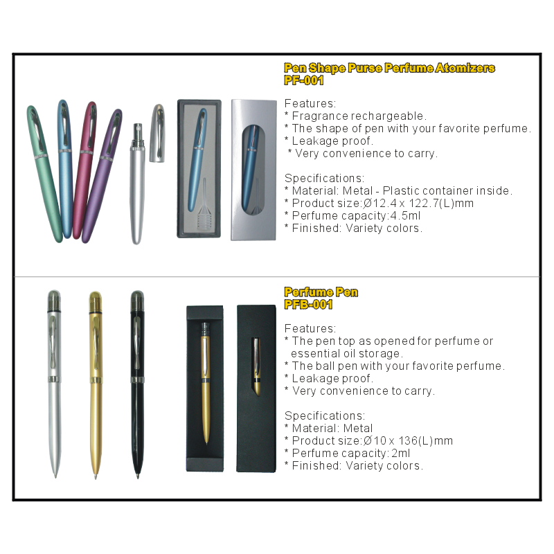 ![]() | Perfume Pen PF-001 & PFB-001 PF-001 / Pen Shape Purse Perfume Atomizer Features: * Fragrance rechargeable. * The shape of pen with your favorite perfume. * Leakage proof. * Very convenience to carry. Specifications: * Material: Metal - Plastic container inside. * Product size:Ø12.4 x 122.7(L)mm * Perfume capacity:4.5ml * Finished: Variety colors. PFB-001 / Perfume Pen Features: * The pen top as opened for perfume or essential oil storage. * The ball pen with your favorite perfume. * Leakage proof. * Very convenience to carry. Specifications: * Material: Metal- brass, steel * Product size:Ø10 x 136(L)mm * Perfume capacity:2ml * Finished: Variety colors. | |||||