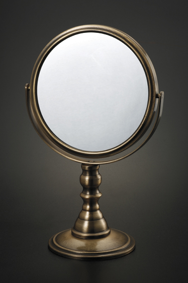 unlighted double sided makeup mirror , metal base and stand , plated bronze-coloured finished . normal and 3X magnifying , diameter of the mirror: 7"