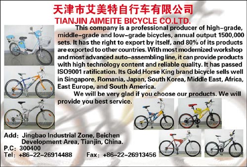 | About this company : Tianjin Aimeite Bicycle Co., Ltd. is a professional manufacturer specializing in bicycles of top, middle and low grades with self-export right. Our production annual capability is 500,000 sets of bicycles 70% of which are exported to the countries and regions all over the world. The leading products with the brand of "Gold Horse King" are sold well in Singapore, Malaysia, Romania, Japan, Korea, the Middle East, Africa, East Europe and South America. Our product: MTB, BMX, FOLDING, SUSPENSION BICYCLE, FEMAL BICYCLE, GAS BICYCYLE, ROAD/RACING BICYCLE Specification: SIZE: 26"/24"/20" FRAME: STEEL/ALLOY FORK: STEEL/ALLOY RIM: STEEL/ALUMINUM BRAKE: V-BRAKE/DISC BRAKE DER.: SHIMANO CHIAN: KMC TYRE: KENDA Contact: nick Login MarginUp for more information. | ||||||