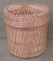 A round canister made of natural hemp (abaca) fiber. Double-walled with criss-cross and pain horizontal weaving.