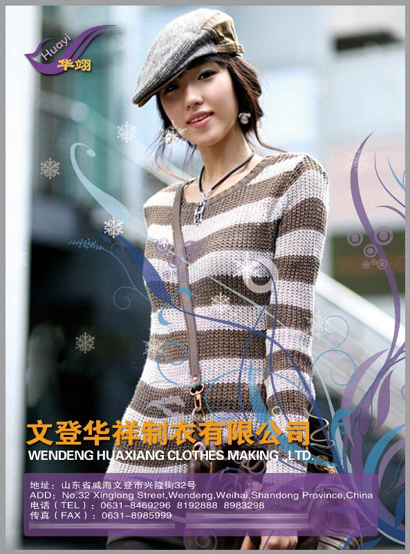 ![]() | Contact US Huaixang Garment Co., Ltd. is an export oriented high quality sweater manufacturing company. It's specializing in knitted sweaters. Having focused on continuous quality enhancement since being established in 1995, we are moving forward with the principles of 'quality first and customer satisfaction - our priority' as our guides. After years of rapid development, Huaxiang now becomes an efficient, reliable sweater vendor. Our products are manufactured exclusively for sale on the overseas market with our main buyers now located in Japan, Europe, America, South America and several other countries and regions. Our mainly brand "Huayi" was launched in 2006 and it is very popular in the local market. Our customers are our number one priority. We promise on time delivery, best quality & competitive price. We are now inviting capable distribution agents and OEM partners from different countries to share in our worldwide expansion. We sincerely look forward to establishing long-term relationships with customers all over the world, and welcome you to visit our factory in the pleasant port city of weihai. Huaxiang is a well established business that has a well deserved reputation for the wanufacture of the manufacture of high quality garments for many different markets. There ethos is "Good Honest Clothing and a Great Service". We look forward to working together in the futhure | |||||