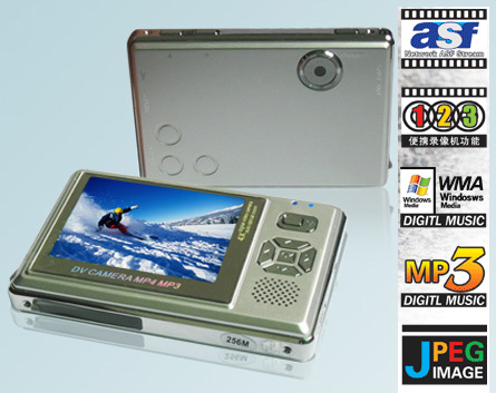 ![]() | DV MP4 (3.0Mpixel) EV-808 Main: 3.0 Mpixel Resolution Can be used as Digital Video Recorder, Digital Camera 1. 2.5 inch TFT LCD, 260K Color 2. SD Plug built-in, can support 1GB SD Memory Card 3. 128MB, 256MB, 512MB Memory Built-in Optional 4. Support MP3/WMA/WAV/ADPCM audio format 5. Support ASF Format MP4, ADPCM Sound 6. Support MPEG4 Video Format 7. PHOTO Browser, support JPEG Format 8. Video Out, plays like VCD effect 9. Microphone Built-In, Voice Recorder 10. Speaker Built-In 11. AV IN, AV OUT, Line-in Digital Record Function 12. Calendar Watch, Games, Memory Check Functions 13. Auto-Off time pre-set, Time / Date pre-set 14. TV-IN, TV-Record 15. HOLD Key to protect the screen 16. Li-on Rechargeable battery Built-in, 1800Mah, can play 10 Hours 17. 90×60.20×17.30mm | |||||