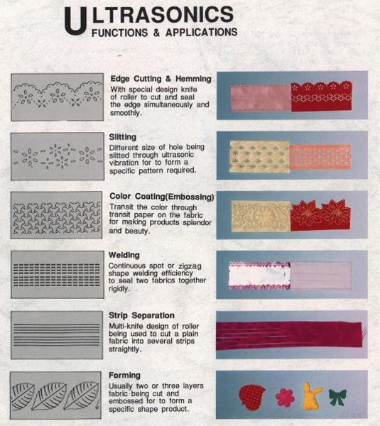 ![]() | Ultrasonic Fabric Processing Machine Functions & Applications Edge Cutting & Hemming: with special design knife of roller to cut and seal the edge simultaneously and smoothly. Slitting: different size of hole being slitted through ultrasonic vibration for to form a specific pattern required. Color Coating: transit the color through transit paper on the fabric for making products splendor and beauty. Welding: continuous spot or zigzag shape welding efficiency to seal two fabrics together rigidly. Strip Separation: multi-knife design of roller being used to cut a plain fabric into several strips straightly. Forming: usually two or three layers fabric being cut and embossed for to form a specific shape product. | |||||