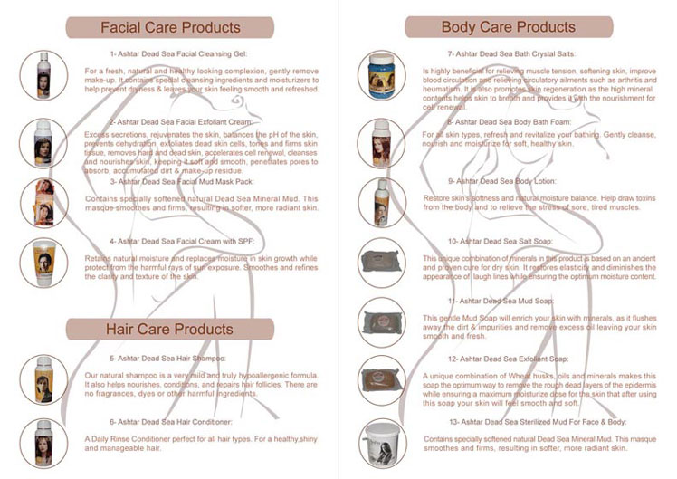 ![]() | Dead Sea Cosmetics Dead Sea Range Products from Jordan made of dead sea minerals. Product range include cleansers, toners, moisturizers, mask, scrub, bath salt, and mud | |||||