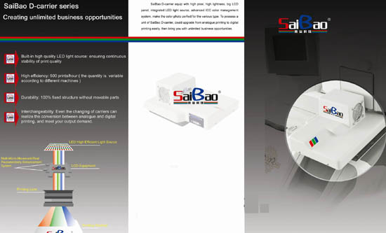 ![]() | Saibao147 digital carrier 147 We have our own Saibao carrier for sell which is in good print effect, easy installation and cheapest price. High resolution at 1440*1050 by EPSON LCD and can print more than 600 prints per hour for 4*6" picture, 1000 prints for 3*5"picture One year guarantee, frever parts support, joint making technology with Sophia. Friendly software operation. The Maximum size depens on your own machine, like 2301, the maximum size is 18". Maynora International Co., Ltd Tel: 86 13457997972 | |||||