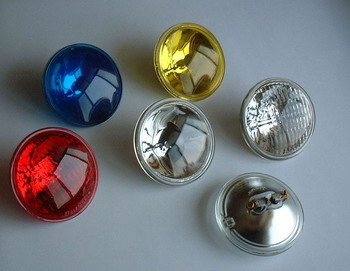 ![]() | sealed beam A sealed beam is a type of lamp that includes a reflector and filament as a single assembly, over which a front cover (lens), usually of clear glass, is permanently attached. A burnt-out sealed beam, broken open to show internals. When the lamp burns out the whole assembly (reflector, lamp, lens array) must be replaced. The advantage is very good alignment, and being completely impervious to dirt, moisture, etc. Headlights for automobiles may be of the sealed beam type, meaning that the reflector, the lens array on the front and the bulb are all one unit that must be replaced together in case of burnout. In theatrical lighting, sealed beam type fixtures are often used. A common size, also used in rock concerts, as well as outdoor architectural lighting, is the Parabolic Aluminum Reflector 64 (PAR64). The PAR is a non-SI unit of measure equal to one eighth of an inch, so a PAR64 light is a light that's 8 inches in diameter. The fixtures that such sealed beam lights go into are called "PAR cans", so a PAR64 fixture is an 8 inch diameter can. Other popular sizes are PAR56, PAR38, and PAR36. Sealed beams come in various voltages, most commonly 6, 12, 28, and 120 V. Aircraft landing lights, which are commonly used in open air concerts and for stage lighting, are sealed beams that have a very narrow beam spread. Beam spreads are designated as FL (flood), SP (spot), NSP (narrow spot), and VNSP (very narrow spot), as stamped on the back of the lamp's reflector. A PAR64 sealed beam typically comes in 250 W, 500 W, or 1000 Watt. | |||||