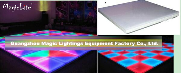 ![]() | Interactive DMX512 LED Dance Floor Light MagicLite-A001 1, LED Dance floor 2, LED lamp: 640PCS F5mm LED Lamp (R: 256/G: 192/B: 192) Color: R, G, B single or mixing color effect. 3, Waterproof Grade: IP65 4, Controlled mode: DMX-512/ Master/slave, Stand alone. Sound 5, DMX Channel: 15 CH (LED digital display) - Voltage: 90-240v - LED lamp: 640PCS F5mm LED Lamp (R: 256/G: 192/B: 192), 1200-1400mcd - Beam Angle: 25 degree - Protect Grade: IP65 - Controlled mode: DMX-512/ Master/slave, Stand alone. Sound - DMX connections: standard 3 pin connector - Work mode: fixed pattern/ wink change/ mixed color change/ sound active - DMX address: set by key of display board - DMX Channel: 15 CH (LED digital display) - Every panel have 4pcs 50cm x 50cm color section, every color section include 2 triangle. - 15mm acryl, It can support 500kgs.1.5-2mm steel (armor plate) - Without fan, silence - Color: R, G, B single or mixing color effect. - Packing Size (L x W x H): 103cm x 103cm x 13cm - Weight: 48kgs | |||||