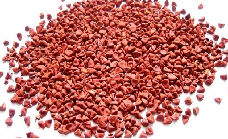 | annatto seed Annatto is a natural carotenoid obtained from bixa orellana shrub.The ripe fruits of annatto on drying yield annatto seed which serves as the raw material for the production of annatto colour. Uses: The annatto dye is non toxic and is mainly used for colouring edible materials like butter , ghee other milk product , cheese , cosmetics etc. | ||||||