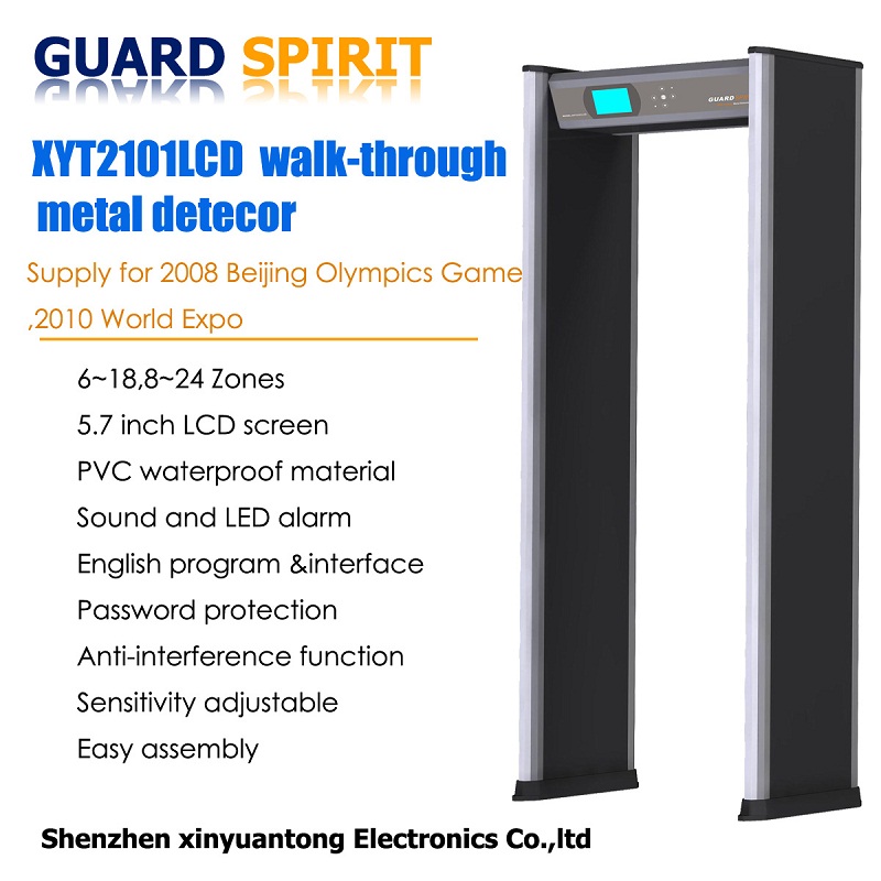 ![]() | walk throuh metal detector XYT2101LCD MODEL: XYT2101LCD (6-18/8-24 zones) Electric current: AC85V~264V/50-60HZ Power: <20W, low consume, low radiation Net weight: 70KG Workplace environment: -20℃~+45℃ Standard: GB15210-2003, CE Standard External size: 2230mm(H)X835mm(W)X580mm(D) Standard Internal size: 1990mm(H)X700mm(W)X500mm(D) Characteristic & Function 5.7 inch LCD screen with Infrared remoter controller Adopt advanced digital signal processing control replaced Traditional analog signal control, better stability. Friendly windows interface, both Chinese and English program, easy to operate. | |||||