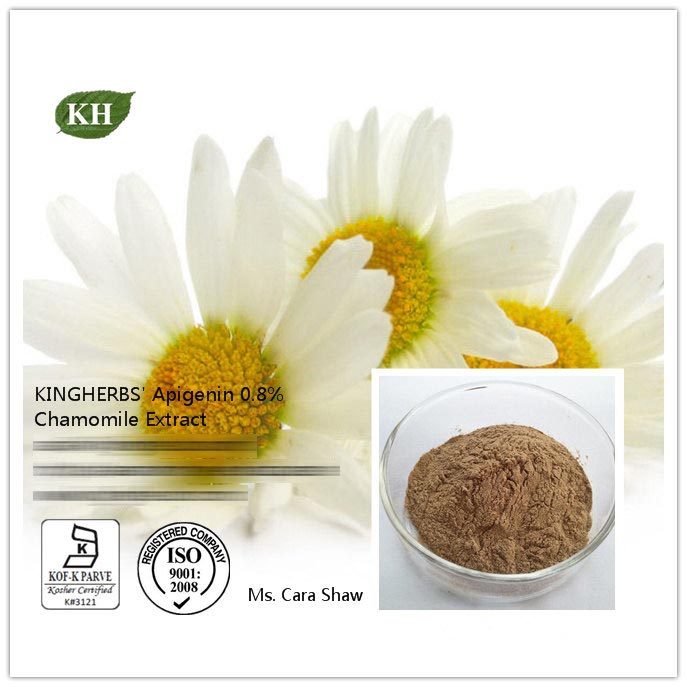 KINGHERBS' Chamomile Extract CAS#: 520-36-5 Other names: Matricaria Extract Botanical Source: Matricaria chamomilla Specifications: Apigenin 0.3%, 0.8%, 98% by HPLC; Apigenin 0.2%, 0.8% by UV; 4:1, 5:1, 10:1 Functions: Curing sore stomach, irritable bowel syndrome Good for sleep Used as a mouthwash against oral mucositis Having acaricidal properties against certain mites, such as Psoroptes cuniculi Anti-cancer Anti-viral Anti-oxidation, anti-inflammatory Tranquilizing and allaying excitemen Relieve of mood Lowering blood pressure Used in Health product, Cosmetic, and Pharmaceutical * Herbal extracts * Softgels * Herbal oil * Natural colors * Herb powders * Vegetable & Fruit powder * Vitamins * Minerals Characteristic: - We can also customize orders as customer's requirements and specifications. - KINGHERBS' is specialized in manufacturing and exporting different kinds of food industry related goods, such as Inulin (90% or 98%), Myricetin, Sea Buckthorn Oil, Green Coffee Bean Extract Chlorogenic Acid etc. - With the effective exporting system and prompt reaction, we ensure that we can transfer the shipping documents and deliver our cargos on time.