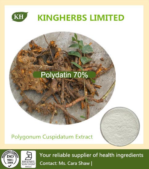![]() | Polydatin 70%, 98% By HPLC CAS No.: 65914-17-2 Polydatin Polygonum Cuspidatum root Extract Giant Knotweed root Extract CAS No.: 65914-17-2 Botanical Source: Polygonum Cuspidatum Specifications: Polydatin 70%, 98% By HPLC Functions: Antisepsis Anti-oxidant Antithrombotic, and Preventing the arteriosclerosis Preventing and curing the cerebral ischemia Lowering the whole blood viscosity Decreasing blood fat and resisting mutagenesis Protecting against heart disease, cancer, and platelet aggregation Weaken white blood cell-enhelial cell adhesion, and activate KATP channels --- * Herbal extracts * Softgels * Herbal oil * Natural colors * Herb powders * Vegetable & Fruit powder * Vitamins * Minerals Exhibition 2015 1. Vitafoods Europe (Palexpo, Geneva, Switzerland), 5-7 May 2015, Booth No.: O3. 2. SupplySide West (Las Vegas, US) , 7-8 Oct. 2015, Booth No.: 2365. KINGHERBS LIMITED; Ms. Shaw; : oging20