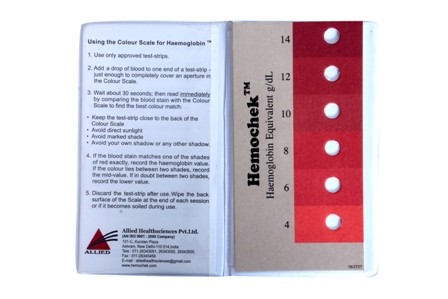 ASK FOR BATCH VALIDATION BEFORE ORDERIING. Colour scale for hemoglobin is being used Internationally as well as by Govt. of India & many state Govt. agencies for Anemia Eradication Programs viz; NRHM, NGO, DHC, PHC, CHC, ASHA-Workers, Anganwadi-Workers, Medical Practitioners, Clinicians, Gynecologists & Blood Banks for Donors Screening etc. | |||||