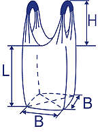 ![]() | Big Bag Container - container is made of polypropylene fabric made on circular loom - value B=75cm which stretches to 96cm after loading, corresponds to UIS standards - recommended load height L=125cm, top cord length H=55cm - depending on fabric’s density carrying capacity varies between 0,5 and 2,0 tons - adjustments of values are available | |||||