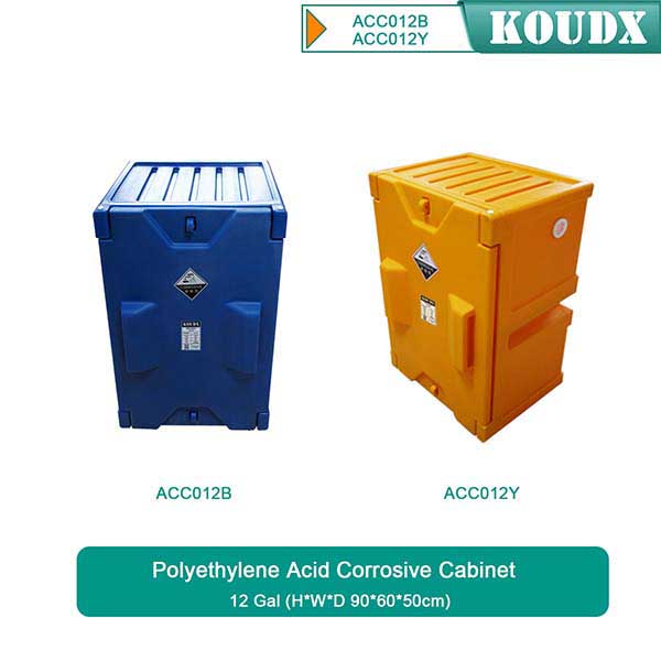 ![]() | KOUDX Polyethylene Acid Corrosive Cabinet ACC012B All KOUDX safety cabinets are built to the highest quality specifications. Key Features: The one-piece body is constructed of high-density polyethylene allowing the cabinet to safely store acids and corrosives near your work area. Completely metal free polyethylene design offers excellent chemical resistance against spills or damaging vapors, such as nitric, sulfuric and hydrochloric. Two poly vents with caps, four poly legs and specific warning labels. Lockable doors (padlock not included) for secure storage of dangerous acids.