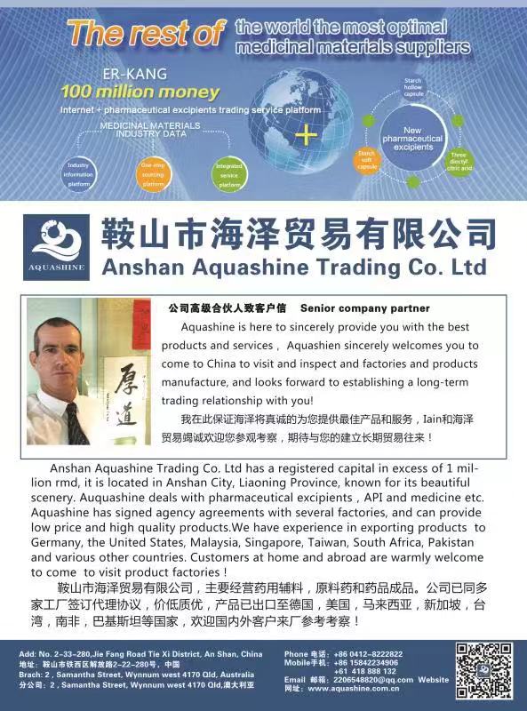 | About this company : Has a registered capital in excess of 1 million rmd, it is located in Anshan City, Liaoning Province, known for its beautiful scenery. Auquashine mainly deals in the polyethylene glycol series which includes polysorbide 80; ethyl oleate; fatty acid glyceride No.36 and No.38 ; crospovidone; sorbitol;maltodextrin; corn starch,paraffin and soybean oil. Also trades API products such as : paracetamol; compound paracetamol DC 90; compound paracetamol DC 96; cefuroxime ester, etc. furthermore these Medicines: water-soluble compound various vitamins ,freeze-dried powders;vitamin C,vitamin B12 etc. Please refer to the following list of products for more specific details. has experience in exporting products to Germany, the United States, Malaysia, Singapore, Taiwan, South Africa, Pakistan and various other countries. Customers at home and abroad are warmly welcome to come to visit product factories ! | ||||||
