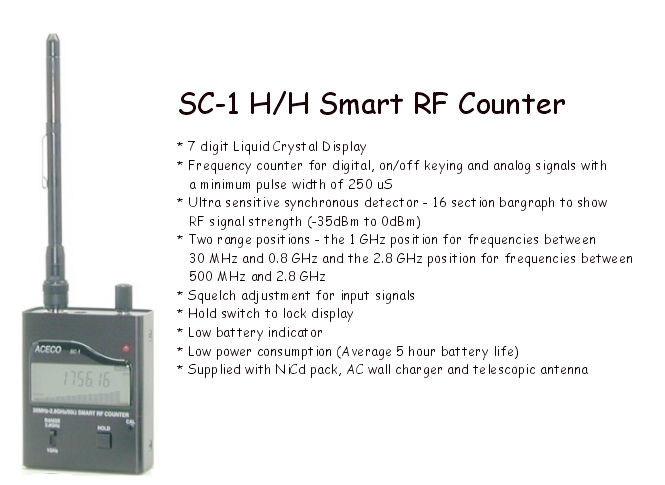 ![]() | Smart RF Counter SC-1PLUS The SC-1 hand-held radio frequency counter is compact, truly pocket-sized, versatile test instrument designed for measuring any digital, on/off keying or analog signal on frequencies between 30 MHz and 2.8 GHz. | |||||