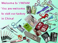 ![]() | Johnson Liu YINFAN Established in 1992, YINFAN is a main manufacturer of tweezers, eyelash curlers, razors / shavers, nail clippers / nail cutters, emery boards, nail buffers, nail files, foot files, callus rasps, cuticle pushers, earpicks / ear cleaners, personal care kits, manicure sets, electric manicure kits, electric toothbrushes, electric shoe polishers (battery operated shoe brushes), cosmetic pencil sharpeners, blackhead removers / acne extractors, beauty scissors / vibrissa scissors / eyebrow scissors, thinning scissors / hairdressing scissors, manicure scissors / cuticle scissors, travel scissors / folding scissors, children's safety scissors / kid's scissors, stationery scissors / office scissors, household scissors, garden shears / pruning shears / pruners, kitchen shears, tailors' shears / sewing shears, yarn scissors, folding knives / pocket knives / lock knives, hunting knives, fantasy knives and swords, nutcrackers / lobster crackers, mousetraps / rattraps, copper bells, etc. For more information contact Johnson Liu now. You are also welcome to visit our factory in Mainland China! | |||||