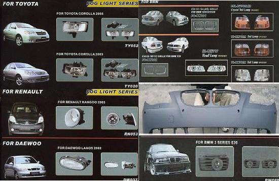 | head lamp,tail lamp,fog lamp,body parts for cars We could supply fog lamps head lamps tail lamps body parts for peugeot505, 405, 404, 305, 309, 206, 307, 205 renault, messedes190, 123, 124, &benz truck;Toyota camry, cressida, corolla, hilux, hiace, liteace, coaster, townace;Dawoo cielo, lanos, nubira;Hyundai kia;Suzuki alto, pajero;Mitsubishi;Nissan;Isuzu;Vw;Jetta;Audi 80, 100, v6;Volvo;Iveco;Lada 2105, 2106, 2121, 2107, 2108;Citroen zx;Etc.Kindly pls browse our listing and feel free to contact us. | ||||||