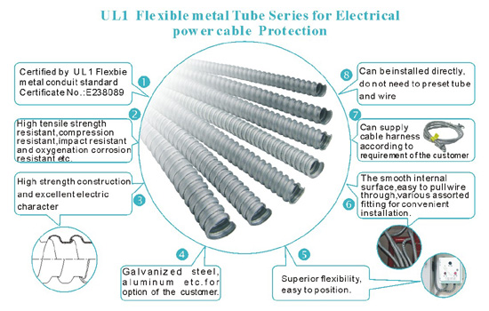 ![]() | Flexible Metal Tube Series for Electrical Protection Product Specification: UL Product Material: Galvanized Steel, Aluminium Characteristics: ·Certified by UL360 Flexbie metal conduit standard ·Certificate No.:E238089 ·Galvanized steel, aluminum etc. for option of the customer ·Extensively applied on electrical safety of various important fields: complex wiring for intelligent building, construction decoration sector, large public project,nuclear power station, oil and chemical sector etc | |||||